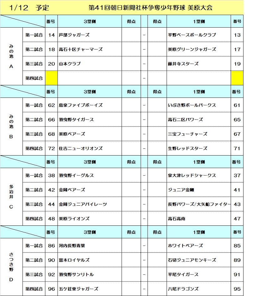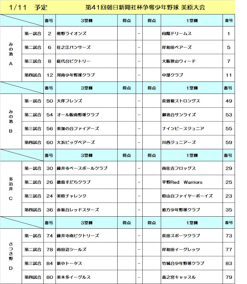 2026年1月7日 / 最終更新日 : 2026年1月7日 sakaimihara-jimukyoku お知らせ 第41回朝日新聞社杯争奪少年軟式野球美原大会の最新組み合わせ 1月11日から始まる大会のトーナメントの最新情報です。 (変更107)第41回大会トーナメント(進行管理)ダウンロード 111予定ダウンロード 112予定ダウンロード Follow me! FacebooktwitterHatenaPocket コメントを残す コメントをキャンセルメールアドレスが公開されることはありません。 ※ が付いている欄は必須項目ですコメント ※ 名前 ※ メール ※ サイト 次回のコメントで使用するためブラウザーに自分の名前、メールアドレス、サイトを保存する。