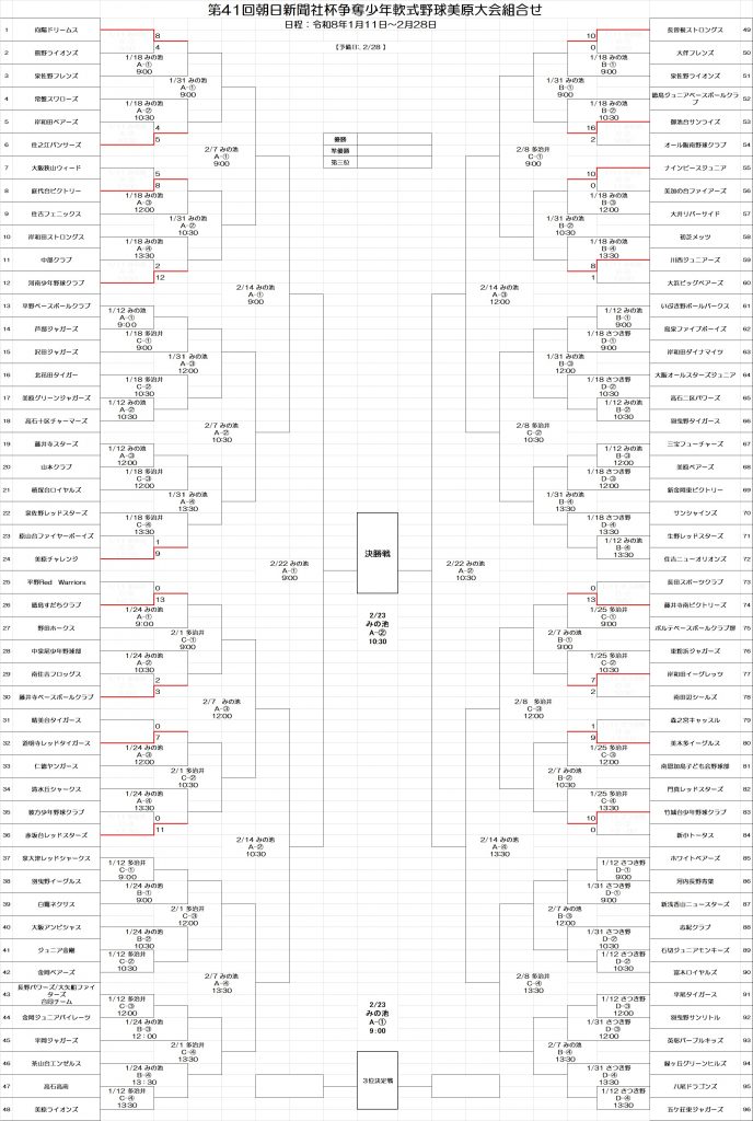 2026年1月11日 / 最終更新日 : 2026年1月12日 sakaimihara-jimukyoku お知らせ 第41回朝日新聞社杯争奪少年軟式野球美原大会がスタートしました。 本日、1月11日極寒のなか、朝日新聞社様もご出席で第41回朝日新聞社杯争奪少年軟式野球美原大会の開会式がおこなわれ、美原ライオンズの森本君の元気な選手宣誓で幕が開きました。頂点目指して頑張ってください。 111トーナメント-2ダウンロード 111トーナメント-1ダウンロード 111結果ダウンロード Follow me! FacebooktwitterHatenaPocket コメントを残す コメントをキャンセルメールアドレスが公開されることはありません。 ※ が付いている欄は必須項目ですコメント ※ 名前 ※ メール ※ サイト 次回のコメントで使用するためブラウザーに自分の名前、メールアドレス、サイトを保存する。
