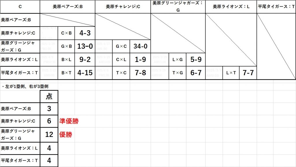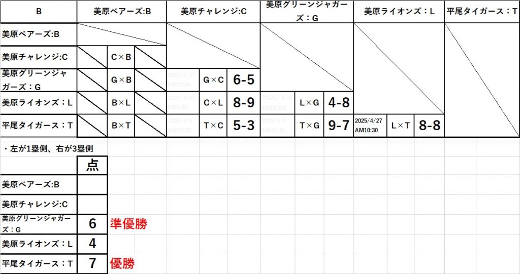 2025年4月29日 / 最終更新日 : 2025年4月29日 sakaimihara-jimukyoku 学童部 2025 堺美原少年軟式野球連盟 春季大会 4月最後の日曜日にB・Cリーグの結果が出ました。最後までもつれましたが、Bは優勝:平尾タイガース 準優勝:美原グリーンジャガーズ Cは優勝:美原グリーンジャガーズ 準優勝:美原チャレンジ でした。 B-2ダウンロード C-1ダウンロード Follow me! FacebooktwitterHatenaPocket コメントを残す コメントをキャンセルメールアドレスが公開されることはありません。 ※ が付いている欄は必須項目ですコメント ※ 名前 ※ メール ※ サイト 次回のコメントで使用するためブラウザーに自分の名前、メールアドレス、サイトを保存する。