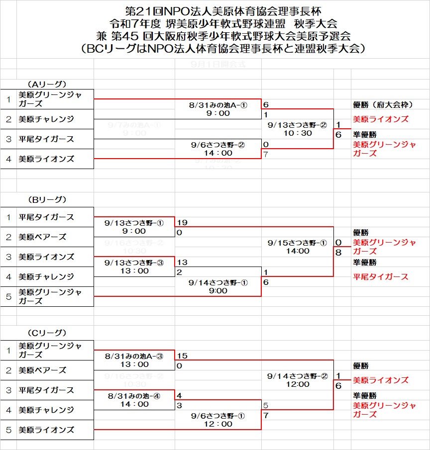 まだまだ暑いこの連休でABCリーグとも結果が出ました。Aリーグ優勝:美原ライオンズ 準優勝:美原グリーンジャガーズ Bリーグ優勝:美原グリーンジャガーズ 準優勝:平尾タイガース Cリーグ優勝:美原ライオンズ 準優勝:美原グリーンジャガーズ でした。 連盟大会はこれで終了となり次はいよいよ、主催大会 朝日新聞社杯です。