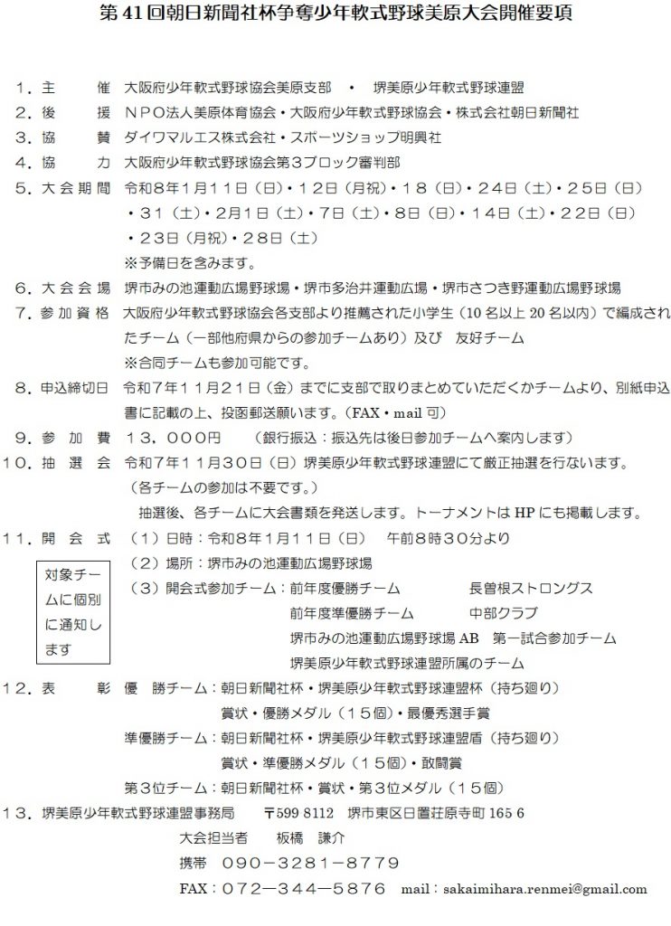 第41回朝日新聞社杯争奪少年軟式美原大会募集について